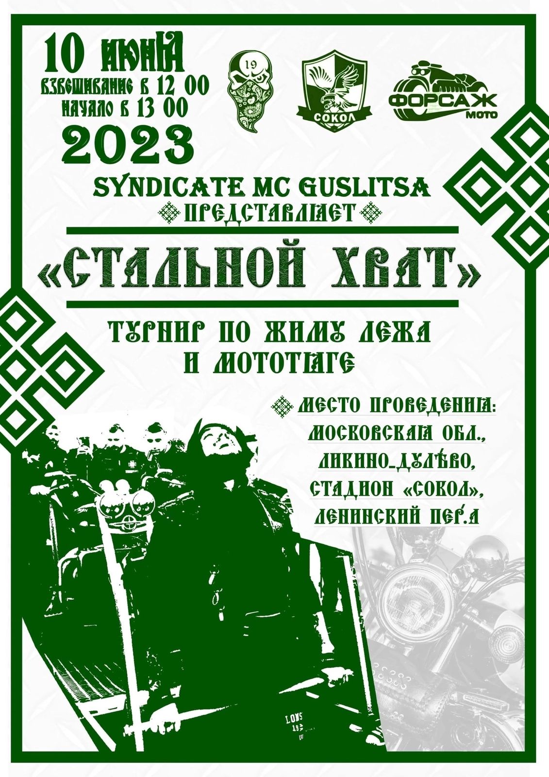 10 июня 2023 года на стадионе «Сокол» в г. Ликино-Дулёво прошли соревнования среди байкеров по жиму лежа и мототяге – «Стальной хват 2023».